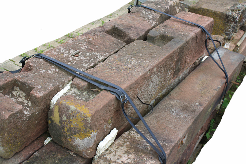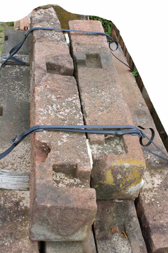 Zaunpfosten aus rotem Sandstein, schön gearbeitet, oben schräg zulaufend, mit Aufnahme für Zaun (zum Einhängen) Länge= ca. 130-185 cm, Querschnitt ca. 19/19 cm z.Zt. noch 1 Stück vorhanden