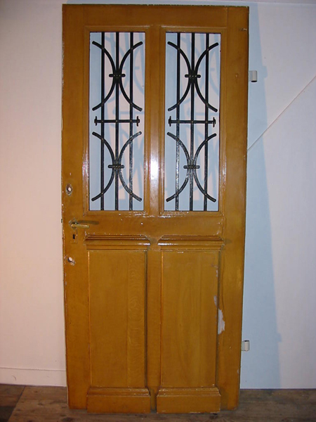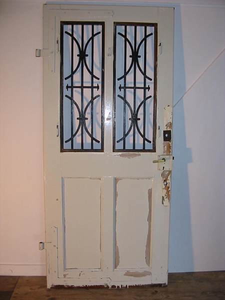 Haustür mit Glaseinsatz und geschmiedetem Ziergitter,schön ausgearbeitete Füllungen,mit großen Winkelbändern, guter Bergezustand, Oberfläche lackiert