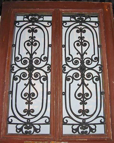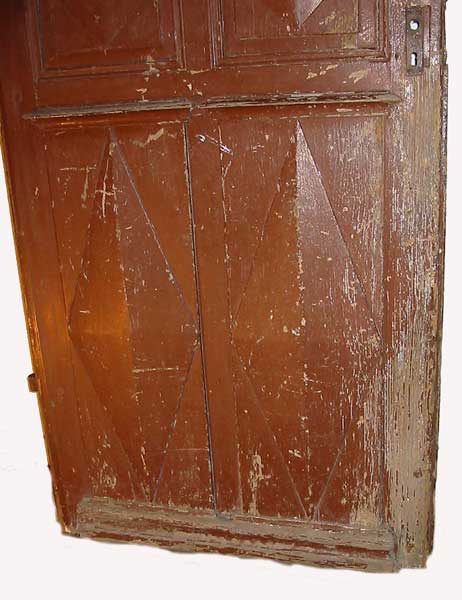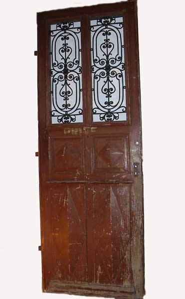 Sehr hohe Haustür mit Glaseinsatz und Ziergitter aus Guss, Füllungen als erhabene Raute guter Bergezustand, Oberfläche lackiert