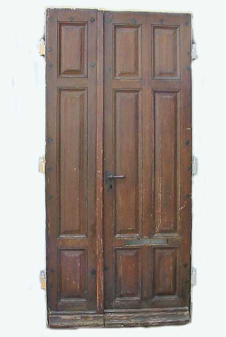Geschlossene 2-flgl. Haustür mit Kassettenfüllungen, aufgedoppelte Konstruktion: aussen Eichenholz, innen Weichholz, sehr massive Beschläge und Kastenschloss Oberfläche lackiertGuter Bergezustand