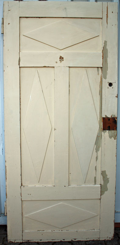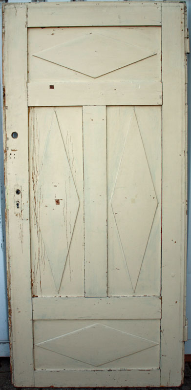 Zimmertür mit 4 Füllungen, rautenförmig abgesetzt Oberfläche lackiert, ohne Schloss, Riss in senkrechter Füllung