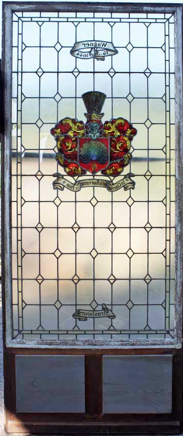 Großes Bleiglasfenster, Eiche, unten mit Holzfüllung, sehr schöne Arbeit, Motive s. Bilder Bergezustand, Glas teilweise kleine Fehlstellen Breite ca. 118 cm, Höhe ca. 278 cm 1 Stck vorrätig