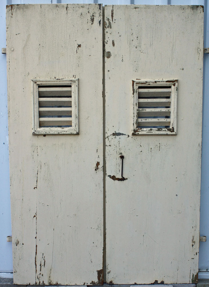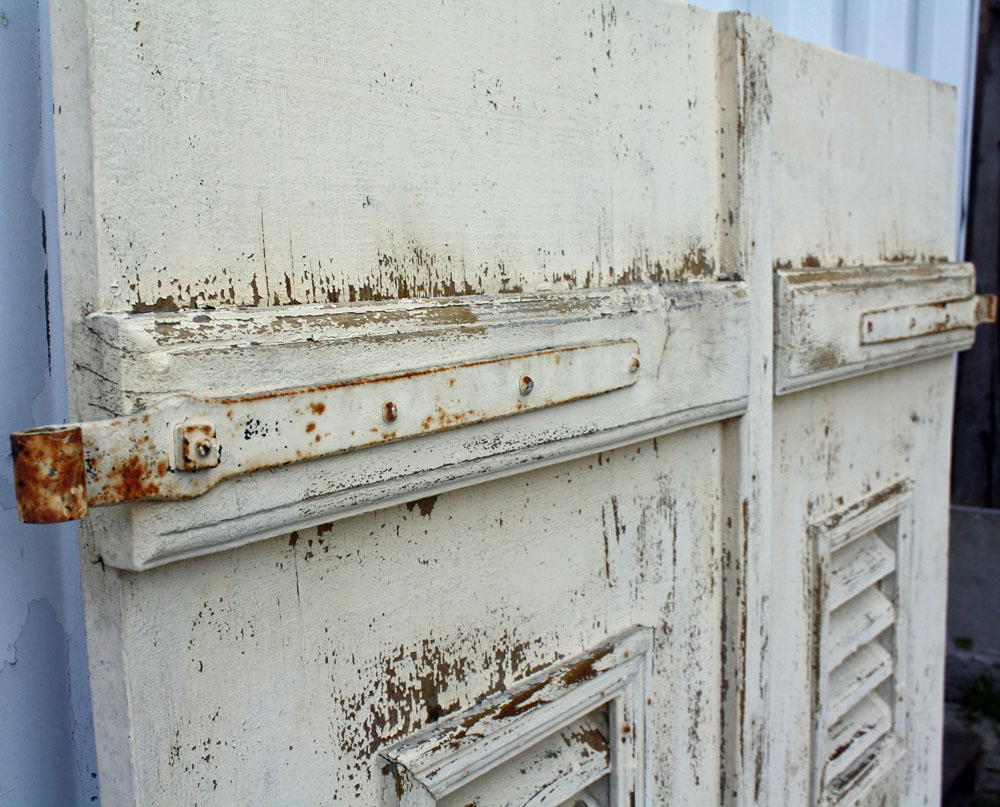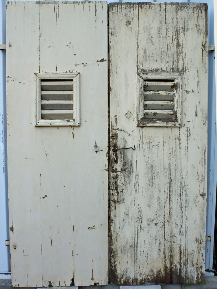 Bretterladen, Weichholz, Querriegel aus Eiche, mit kleiner Lüftungsöffnung Bergezustand, lackiert 1 Paar Maße ca. 51 x 152 cm vorhanden 1 Paar Maße ca. 56 x 153 cm vorhanden