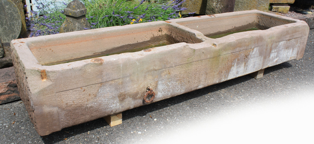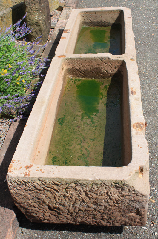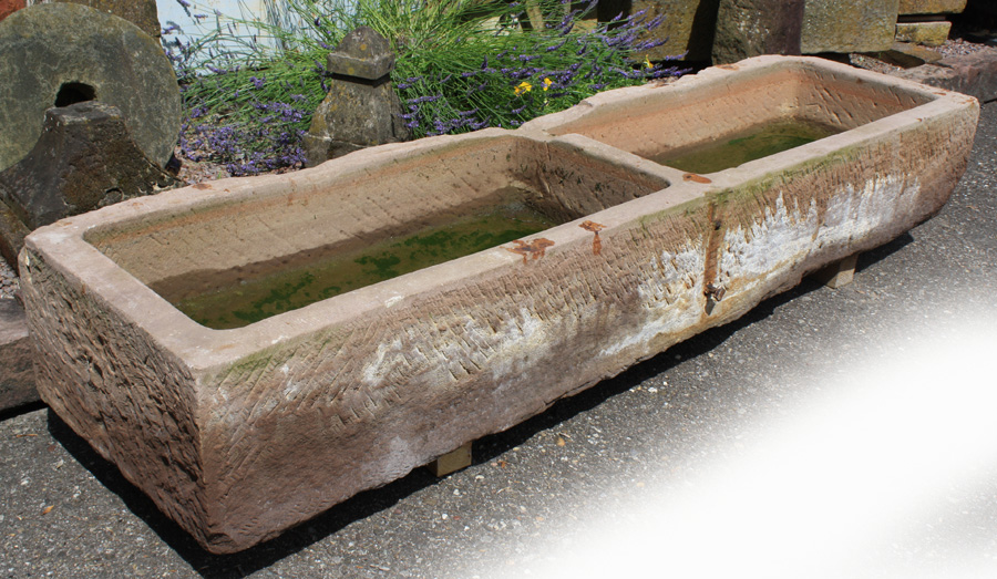 Trog, roter Sandstein, mit Mittelwand l/b/h = ca. 223/60/34 cm alte Pferdetränke mit Gebrauchsspuren